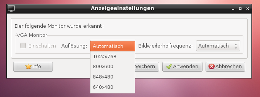 Ubuntu gibt sich anwenderfreundlicher und hat in seinem Kontrollzentrum einen Eintrag „Monitore“, mit dem jedoch nur eine automatische Erkennung nochmals angestoßen werden kann. Dies funktioniert jedoch nicht immer zuverlässig.