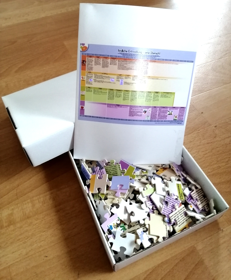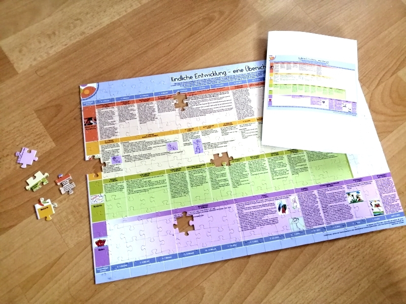 Das Puzzle im Format 30 x 45 cm besteht aus 266 Teilen. Es bietet einen ansprechenden Überblick über kindliche Entwicklungsschritte zwischen dem ersten Vierteljahr und dem Schulalter und eignet sich für puzzlebegeisterte Pädagogen als Geschenk 🎁. Auch Erzieherinnen können von der feinmotorischen Übung ihrer praxisrelevanten Puzzlekompetenz in Kombination mit entwicklungspsychologischem Wissenszuwachs profitieren 😉.